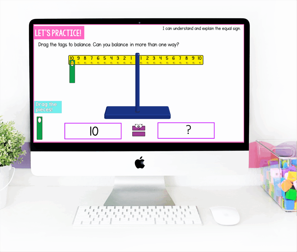 We also use a large number balance visual during our Balancing Equations mini lessons for our whole group math time! All of my math units include pre-made slides that are no prep and ready to go to teach all first grade math topics!