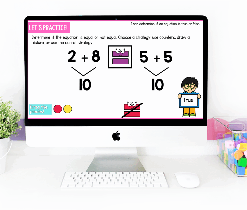 Once students understand how to compare both sides, it’s time to practice determining whether equations are true or false.
