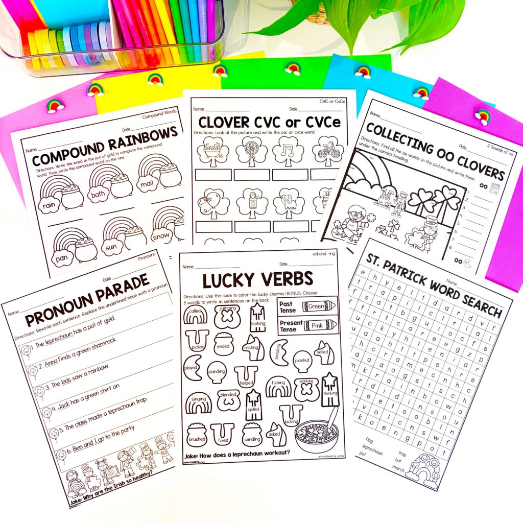 I also use these St. Patrick’s Day literacy worksheets in 1st grade to review phonics, reading, grammar, and writing skills taught throughout the year.